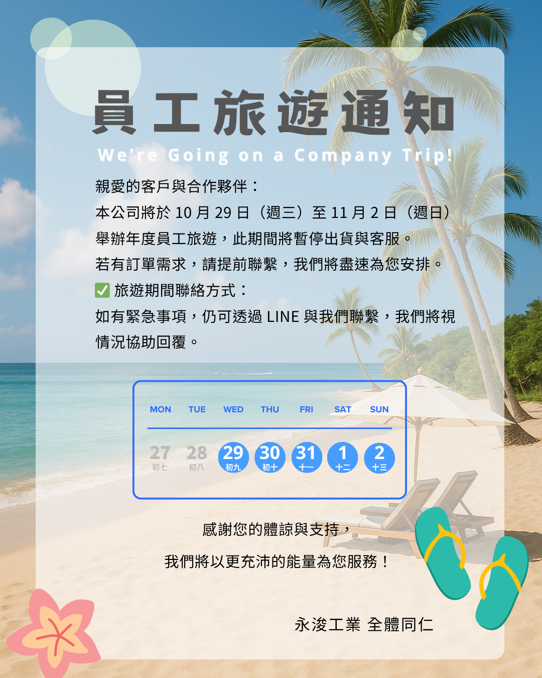 【重要公告|員工旅遊店休通知】 我們將於10/29(三)~11/2(週日)舉辦員工旅遊,本公司旅遊期間內無營業、無寄貨服務 如有業務上報價或訂購需求者,麻煩提前與我們聯繫!